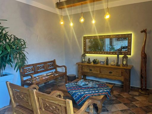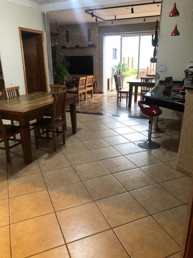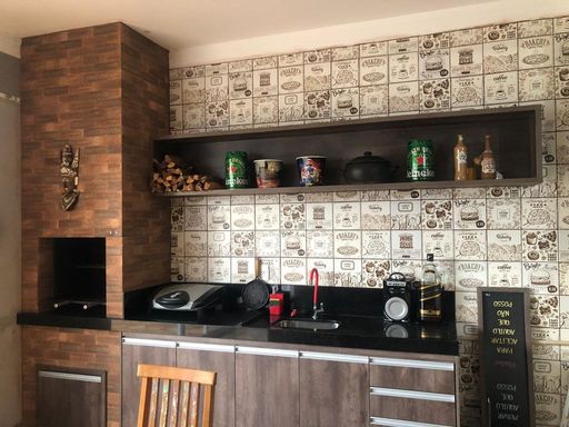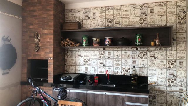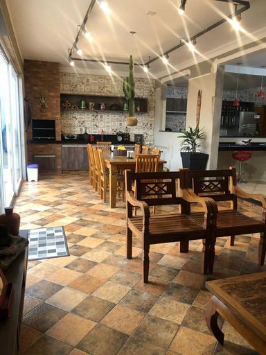 A área gourmet é um espetáculo à parte: churrasqueira revestida em porcelanato rústico, pia em granito São Gabriel, planejados em MDF, iluminação interna e portas de vidro que permitem total integração com piscina, quintal e espaço do fogo de chão.